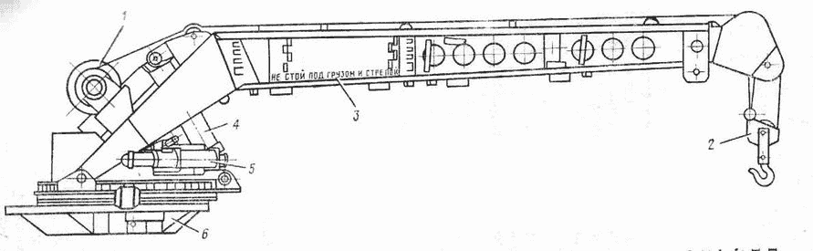 1 – грузовая лебедка; 2 – крюкова обойма; 3 – стрела; 4 – гидроцилиндр вылета стрелы; 5 – механизм поворота; 6 – опорно-поворотное устройство.