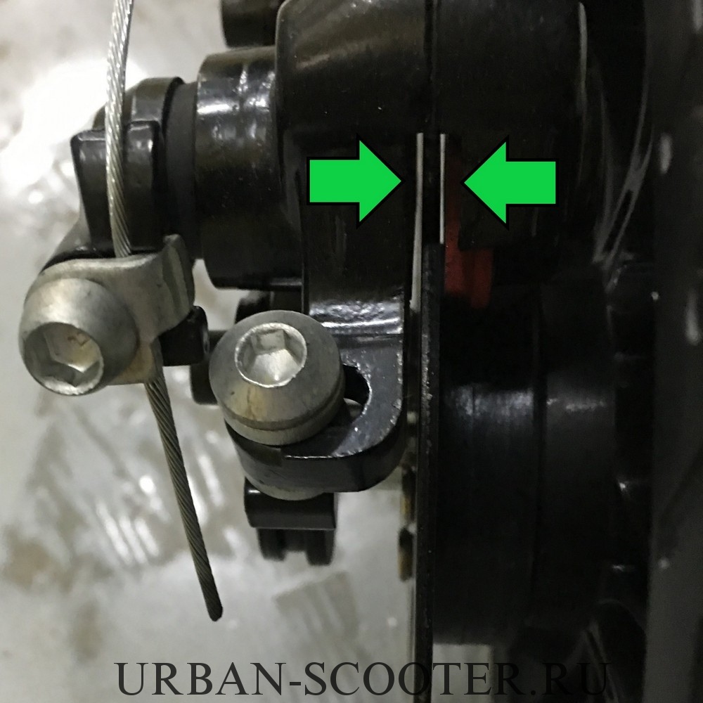 Левая и правая колодки регулируются независимо друг от друга. Левая колодка регулируется при помощи микроподстройки натяжения тросика. Смотрите фото ниже. Затяните или ослабьте пластиковую гайку, чтобы уменьшить или увеличить зазор между левой колодкой и диском.