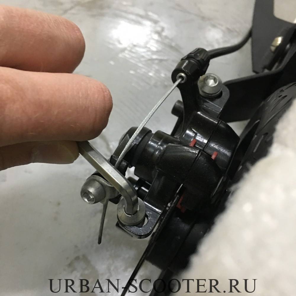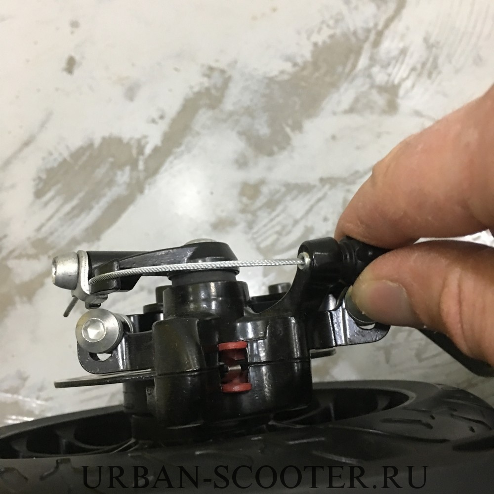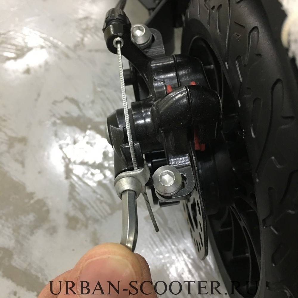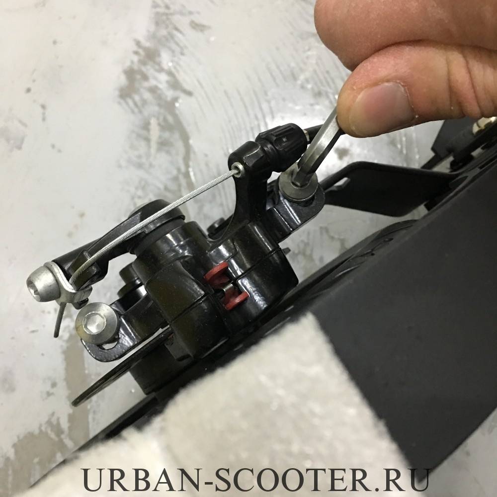 Для начала разложите самокат и понажимайте ручку тормоза на руле. Бывает, что в сложенном виде тормозной тросик перетягивается и зажимает колодки. В большинстве случаев тормоз отрегулирован нормально и дополнительных действий не требуется. Даже если при вращении колеса диск немного задевает колодки, то можно это проигнорировать, так как в процессе обкатки колодки притрутся.