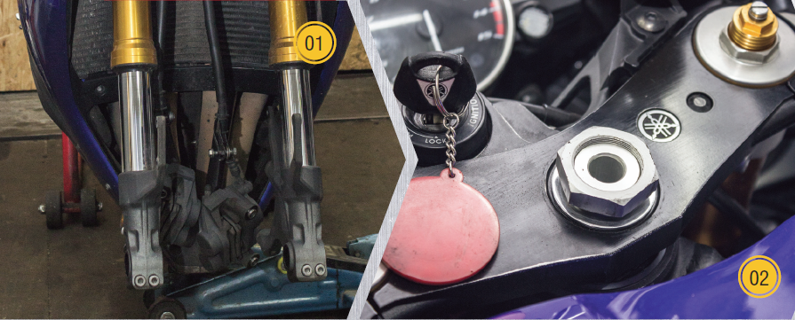 Отсчёт начнём с того момента, когда перед мотоцикла уже вывешен подкатом, домкратом, талью или любым другим приспособлением, переднее колесо снято, суппорты отсоединены от вилки и отведены в сторону (фото 2). Откручиваем центральную гайку, которая удерживает ось и фиксирует траверсы (фото 3). Далее ослабляем болты на торцах траверс, аккуратно вытаскиваем перья и убираем их в безопасное место, чтобы не повредить (фото 4). После отставляем в сторону верхнюю траверсу и специальным серповидным ключом откручиваем расположенную под ней шлицевую гайку (фото 5). Следом освободится нижняя траверса, в которую в свою очередь впрессована ось. На ось с небольшим натягом нанизан нижний подшипник рулевой колонки вместе с пыльником, которые снимаются подручным инструментом (фото 6).