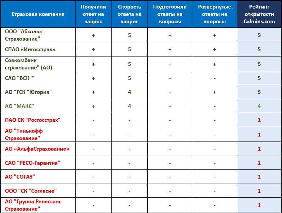 На основе полученных ответов мы сформировали рейтинг открытости Calmins. Результаты представлены ниже.