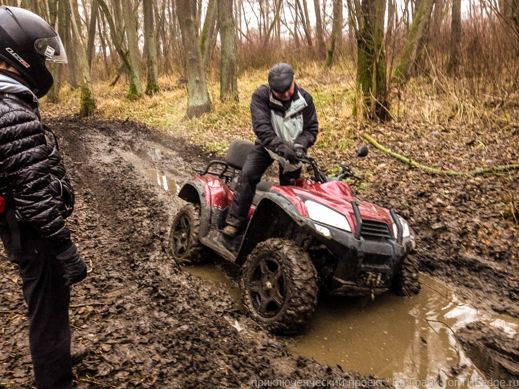 Так бы мы и ездили по суровому калининградскому лесу, его тропинкам, разрывая осеннюю тишину ревом наших бензиновых двигателей, если бы в одном из мест, где визуально была сама настоящая топь, мы чуть было не перевернулись. Андрей, не верно рассчитал проезд по достаточно глубокой луже. В результате этого пассажа, наш квадроцикл накренился, и ушел левыми колесами в грязь, а движок заглох.