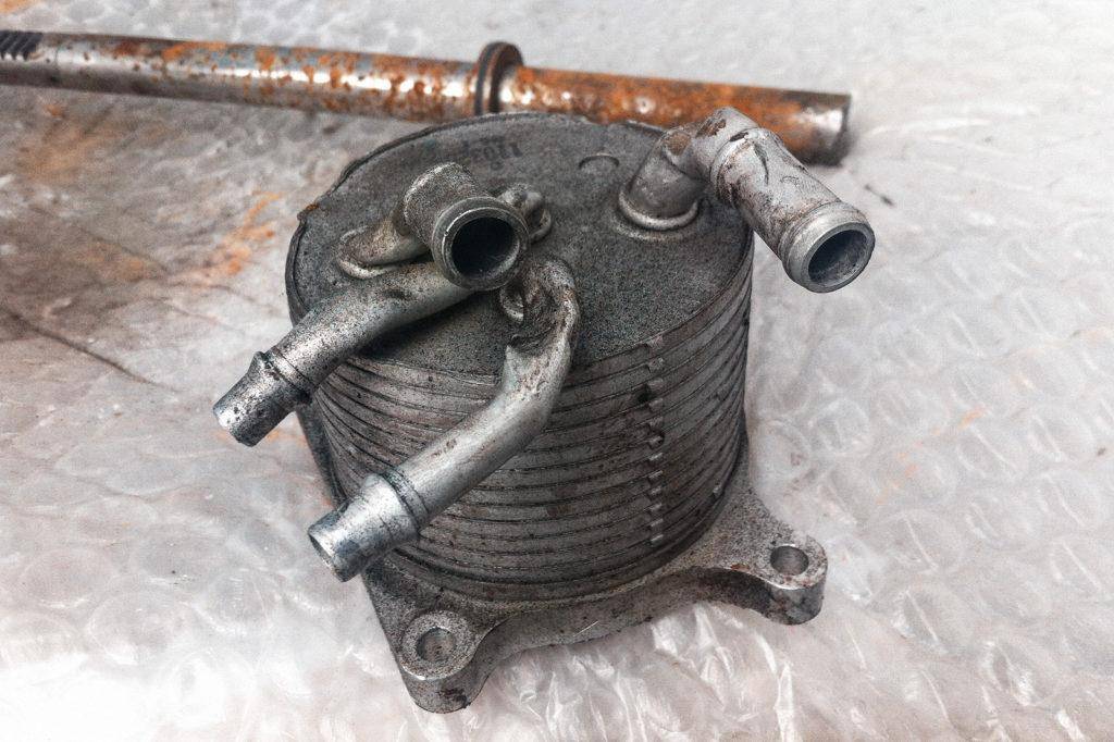 Повреждение маслоохладителя такое бывает после ДТП и «кривых рук» автомехаников. Такие механики не раз ставили маслоохладитель вверх ногами и этим перегибали трубки. Отсутствие циркуляции обязательно приводит к перегреву масла. Возможно и появление утечки масла в месте крепления от вибрации.