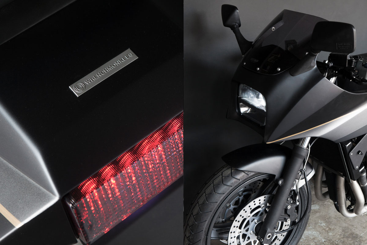 As for the bodywork and accessories, the Wrenchmonkees made plenty of subtle changes there too. All of the Ninja’s lighting aside from the headlight are now LED units. Under the tinted screen sits a ’94 ZX-9 instrument cluster and the fluid reservoirs were taken from a ZZ-R1100. The levers and clip-on bars are TRW items and the top yoke is from a Zephyr Z750. The bodywork remains standard but it was decided to leave off the lower sections of the front fairing. This aides further in engine cooling and exposes those lovely satin finish exhaust headers.