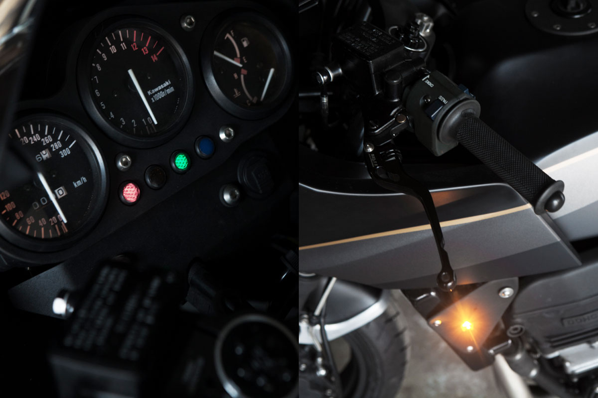 Using the engine from the ’91 donor Per and the team set about building their ideal Ninja powerplant. To step performance up a notch they installed a 973cc kit and paired it with a set of Mikuni TMR 36 carbs. Knowing the GPZ900R was susceptible to overheating a new cooling system was devised. A larger, more efficient radiator unit from a ZRX1100 now sits up front and it’s backed up by an aftermarket oil cooler. The thermostat was also relocated from its original position over the valve cover to the front of the engine and everything is held in place by custom brackets that double as mounting points for Motogadget M-Blaze Pin indicators.