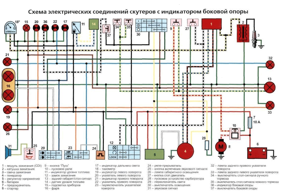 Стоит отметить, что в электрической схеме скутера, так же как и в любой электронной схеме, есть общий провод. У скутера общим проводом является минус (—). На схеме общий провод показан зелёным цветом. Если посмотреть повнимательнее, то можно заметить, что он соединён со всем электрооборудованием скутера: фарой (16), реле поворотов (24), лампой подсветки приборной панели (15), индикаторными лампами (20, 36, 22, 17), тахометром (18), датчиком уровня топлива (14), звуковым сигналом (31), задним габаритом/стоп-сигналом (13), пусковым реле (10) и другими приборами.