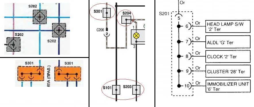 Помимо разъемов (Connectors) провода в автомобиле соединяются при помощи пакета перемычек или соединительных колодок ( в электросхемах на английском — Splice). Обозначаются соединительные колодки, как вы видите на рисунке, буквой «S» и порядковым номером, например: S202, S301.