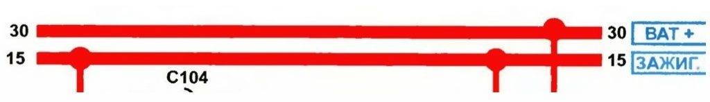 Цепь 30 — идет от плюсовой клеммы аккумулятора, 15 — от аккумулятора через замок зажигания — «Зажигание 1»