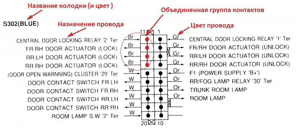 Помимо разъемов (Connectors) провода в автомобиле соединяются при помощи пакета перемычек или соединительных колодок ( в электросхемах на английском — Splice). Обозначаются соединительные колодки, как вы видите на рисунке, буквой «S» и порядковым номером, например: S202, S301.