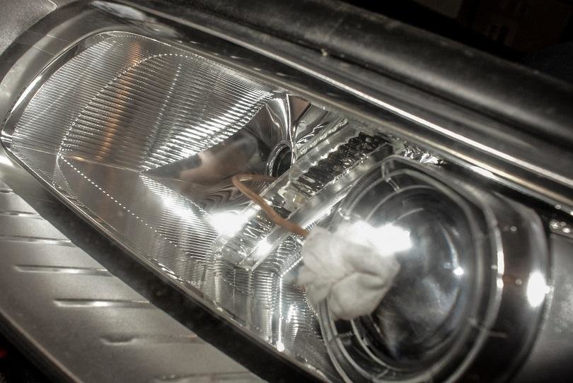 В зависимости от конструктивных особенностей прибора головного освещения, может потребоваться примотать ватный тампон на проволоку, чтобы очистить труднодоступные места