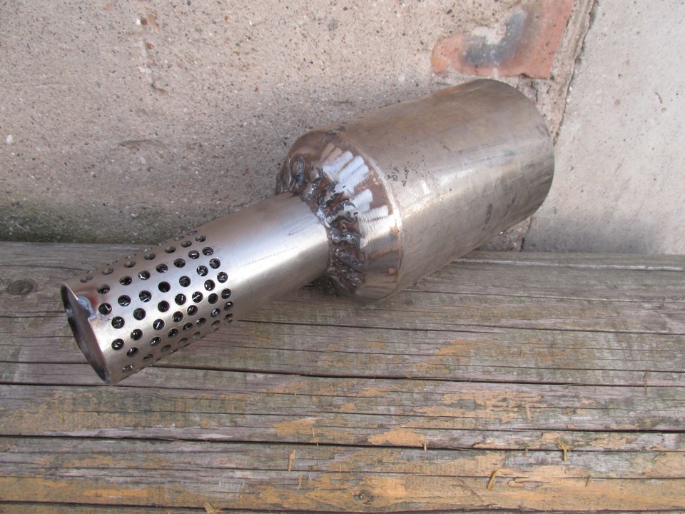 - Вварить выпускную трубу. Для эстетики можно использовать одинарную или двойную хромированную трубу. Часть, которая находится внутри глушителя, перфорировать дрелью.