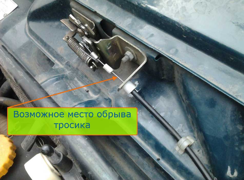 Обрыв тросика легко распознать по свободному болтанию рычага для открытия капота.