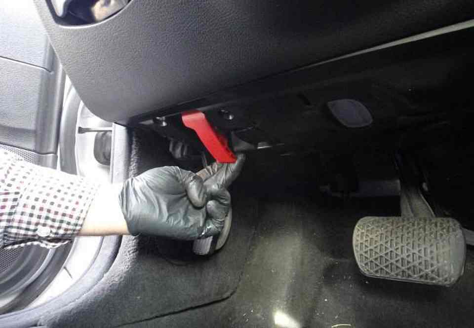 - Освободите доступ к месту фиксации тросика к рычагу. Уберите коврик, снимите кожух приборной панели и другие элементы, если они мешают. Ничего не должно препятствовать выполнению работы.