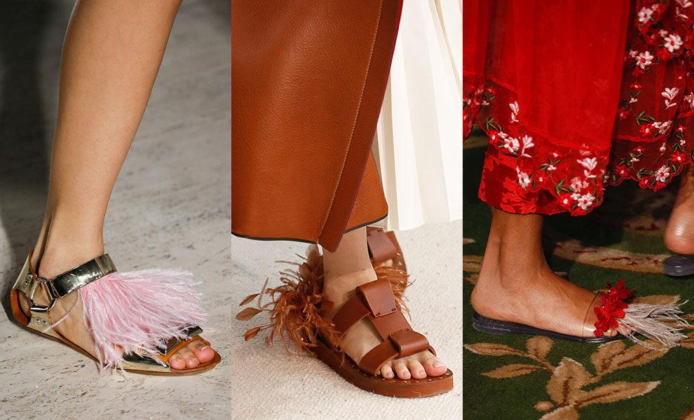 В моде яркая экстравагантность. Популярные украшения — банты, разноцветные камни, плетения, рюши, складки, шнуровка. Не менее популярна классика, роскошь, спортивный стиль, дополненный бахромой и кисточками. В тренде устойчивый каблук, шпилька, мини-шпилька, платформа, танкетка. Новинка этого сезона — обилие разных по ширине ремешков. Модным считается цветочный, анималистический принт, однотонная расцветка.