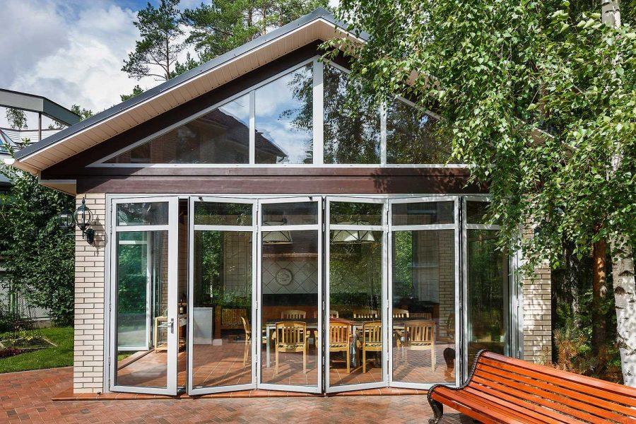 Теплый образ — актуален для любого времени года. Двухкамерные конструкции защитят беседку от холода как зимой, так и летом. Как и безрамное стекло, это дорогой вид укрытия.