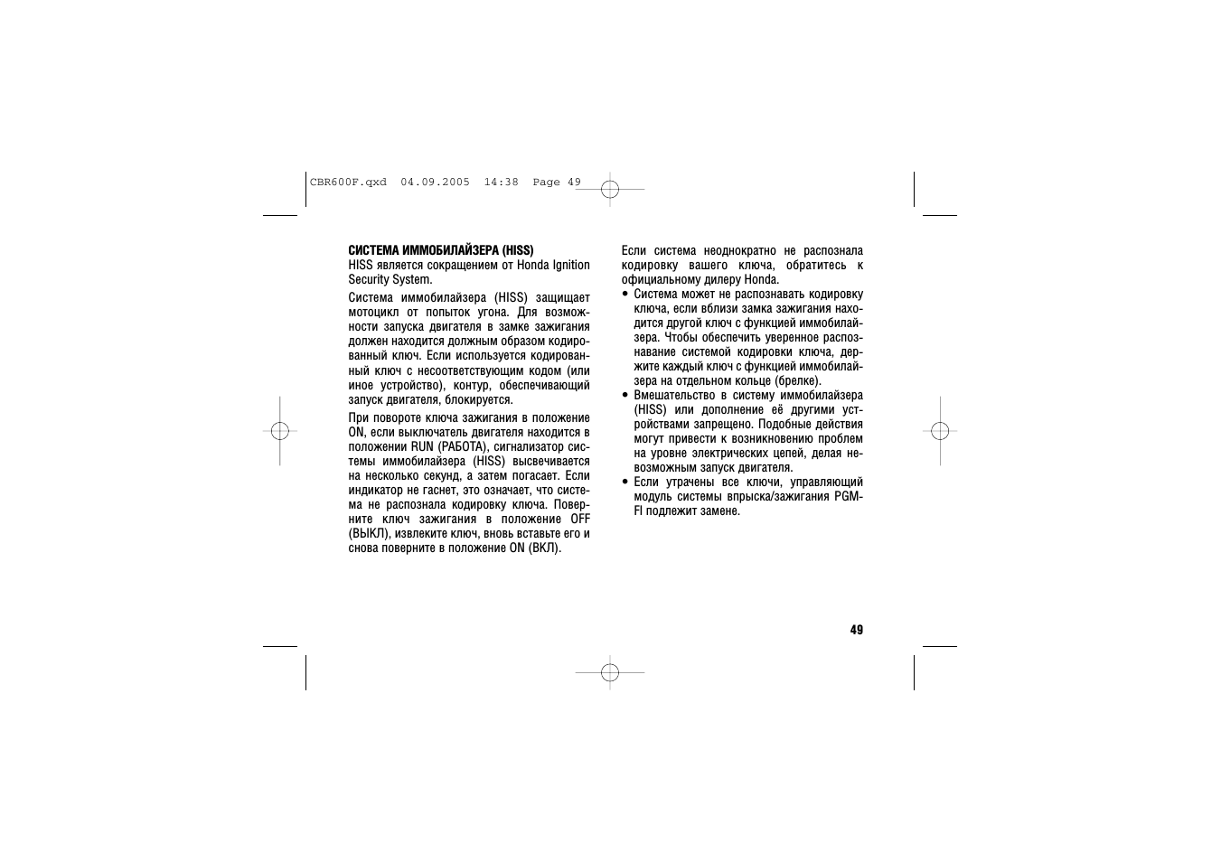 СИСТЕМА ИММОБИЛАЙЗЕРА (HISS)HISS является сокращением от Honda IgnitionSecurity System.