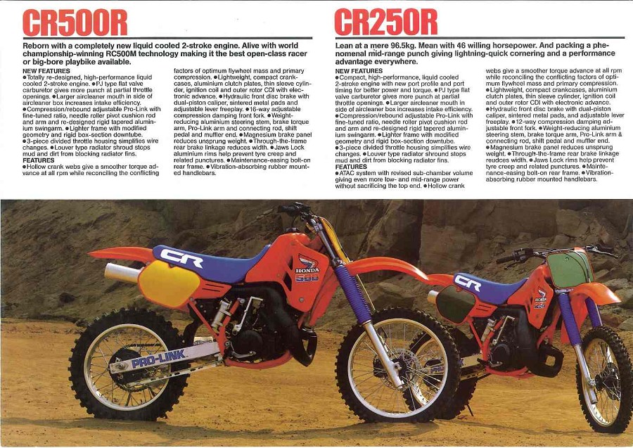 Honda пришлось многое пересмотреть в модели CR250. Изменения коснулись двигателя, на котором был установлен новый мощностной клапан похожий на YPVS компании Yamaha, но решение Honda отличалось уникальным дизайном и гораздо более сложным в исполнении. Далее в списке основных изменений был переход на систему картриджа в вилке Showa, что давало гораздо более точный контроль и более широкий диапазон регулировки демпфирования. Эти удивительные вилки с картриджем были впервые использованы в конце семидесятых на заводских машинах Honda. В общем и целом, в 1986 году Honda удалось сделать по-настоящему высокотехнологичную машину и лучшую в классе, что оценило большинство гонщиков.