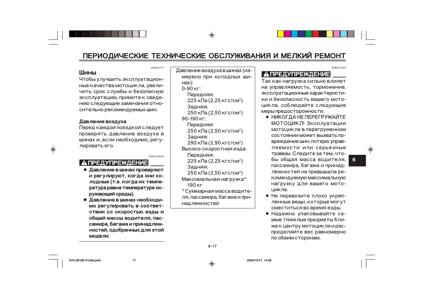 НИКОГДА НЕ ПЕРЕГРУЖАЙ-ТЕ МОТОЦИКЛ ! Эксплуата-ция перегруженного мото-цикла может вести к повре-ждению шин, потере управ-ления или к серьезнымтравмам. Суммарная массаводителя, пассажира, багажаи вспомогательного обору-дования не должна превы-шать указанной нагрузкидля данной модели мото-цикла.