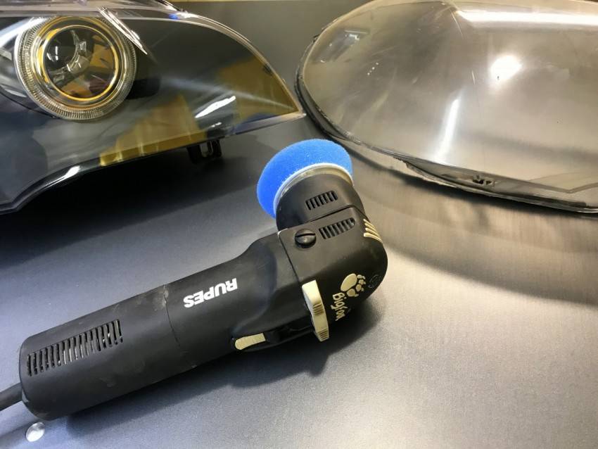 Такой способ воздействия считается более эффективным для пластиковых автомобильных фар, но для него помимо малярного скотча и наждачной бумаги требуется машинка со специальной насадкой и полировочная паста.
