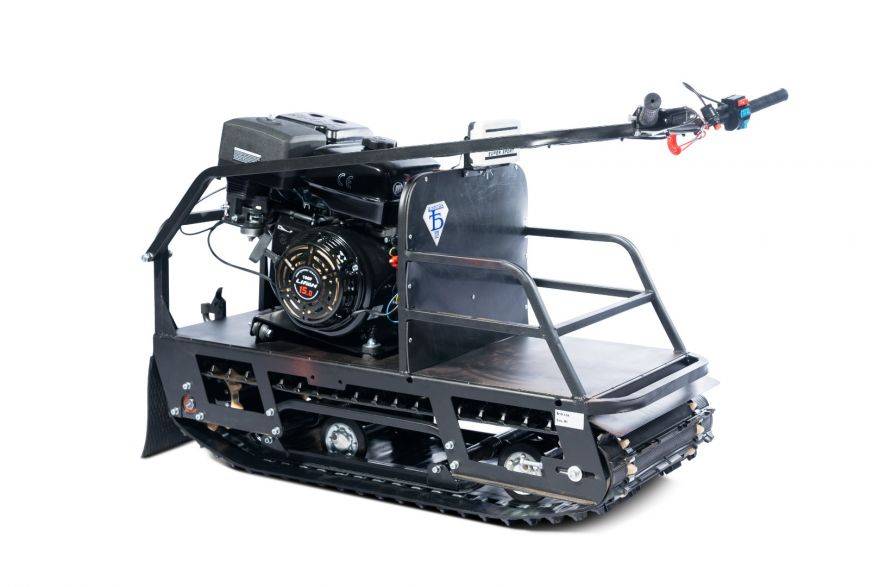 Мотобуксировщик с гусеницей 500 мм, вариатором Сафари и двигателем 11 л.с., электростартер + сани волокуши Мастер Про 150. В числе конструктивных особенностей: модульная конструкция (силовая установка с трансмиссией + гусеничный движитель), оптимальная развесовка, передний привод и передний угол атаки от снегохода Буран.