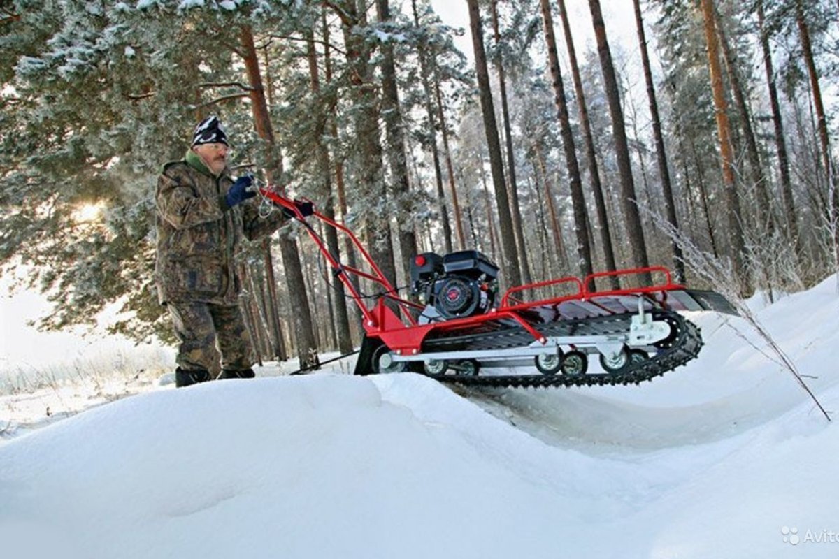 Универсальная модель, которую по достоинству оценят охотники и рыболовы в любое время года. Агрегат позволяет передвигаться как по болоту, так и по снежным заносам. Мотобуксир оборудован 9-сильным мотором. Расходование бензина за час – 2,5 л. Тип привода — передний, что улучшает проходимость модели. Максимальная грузоподъемность на 2 сцепленных санках-волокушах — по 125 кг.