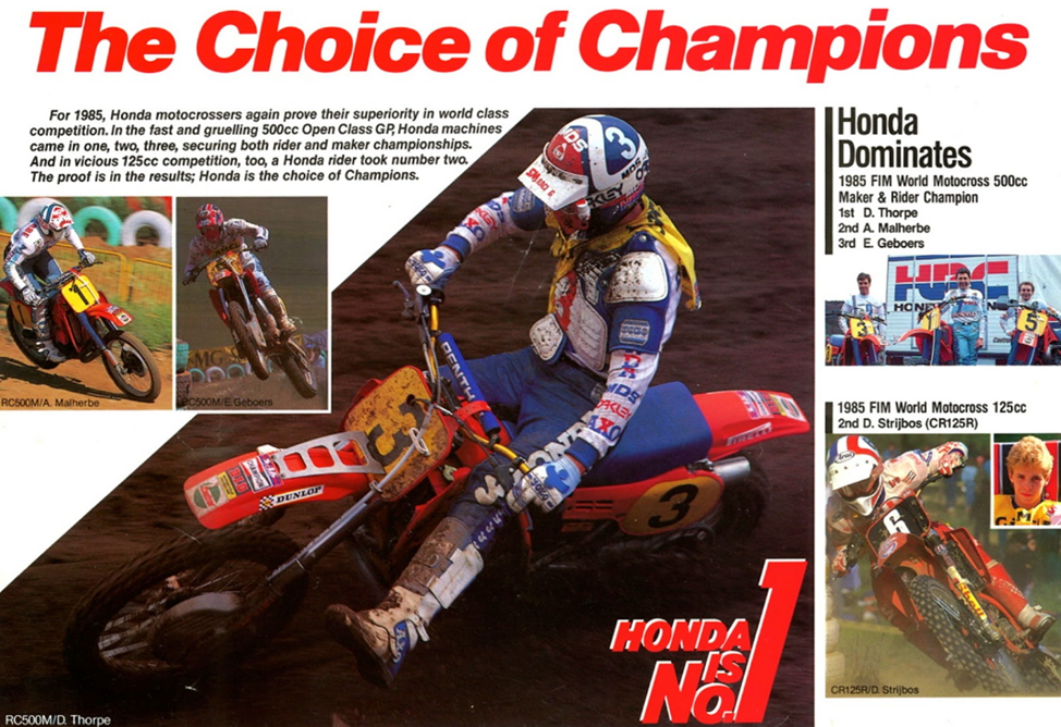 1985 год. Исторический момент для Honda – тройка призеров. Дэйв Торп – чемпион мира в классе 500сс, а Андре Малерб и Эрик Гебоерс – серебряный и бронзовый призеры. На следующий год они вновь займут все три призовых места в той же последовательности.