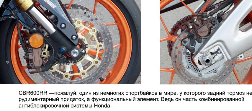 Думаю, комментарии тут излишни. Honda CBR600RR — единственный из тестовых аппаратов, который был оснащен ABS. И, конечно, не простой, а комбинированной, которую японский концерн