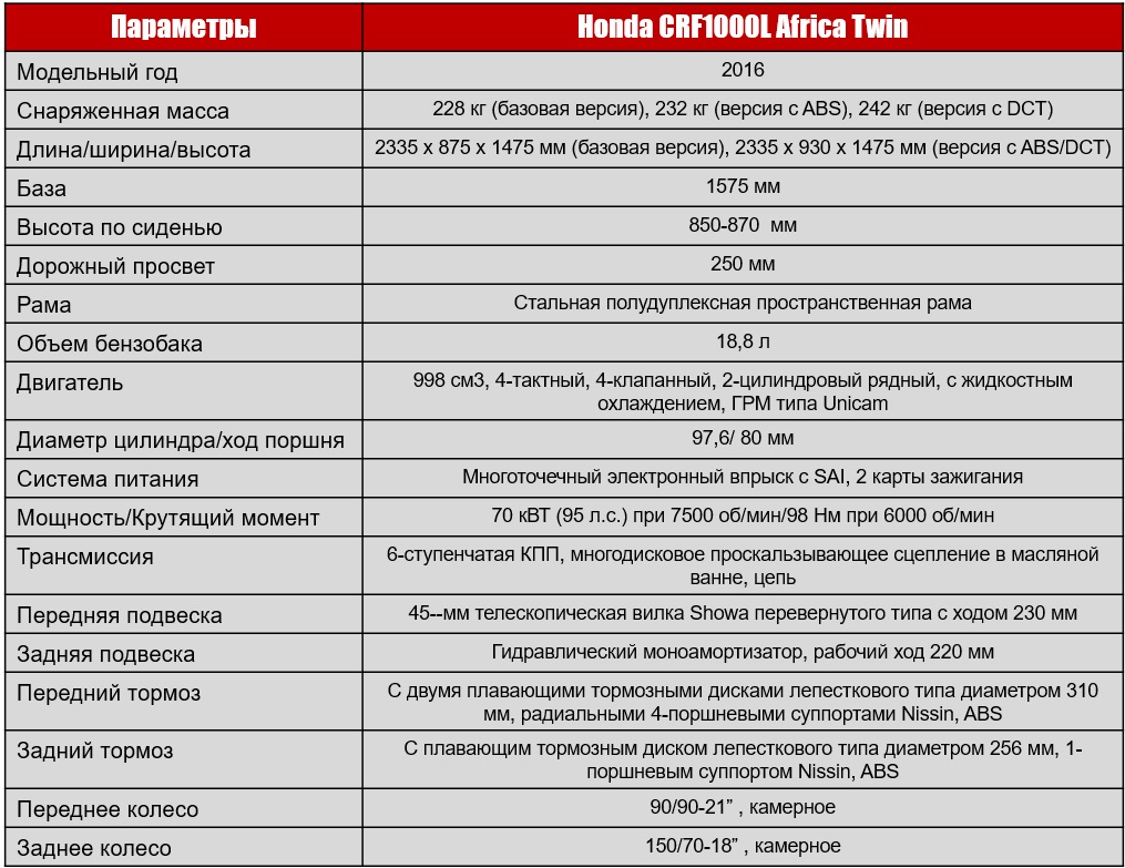 | Масса мотоцикла (снаряженная) | 228 кг – CRF1000L Africa Twin 232 кг – CRF1000L Africa Twin (ABS) 242 кг – CRF1000L Africa Twin (DCT) 243 кг – Adventure Sports 253 кг – Adventure Sports (DCT) 242 кг – Adventure Sports (Япония) 252 кг – Adventure Sports (DCT) LD (Япония) 230 кг – CRF1000L Africa Twin (ABS), с 2018 года 240 кг – CRF1000L Africa Twin (DCT), с 2018 года |