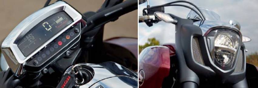 По форме, оформлению и содержанию приборная панель F6C Valkyrie очень похожа на аналогичный элемент Valkyrie Rune! С той разницей, что у «Руны» дисплей был расположен на бензобаке, а у новой «Валькирии» —как у нормальных мотоциклов, на руле. Фара новинки Honda и её «оперение» выполнены в стилистике популярных в Японии роботов трансформеров