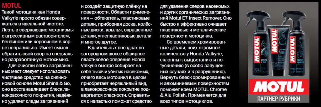 Гастрономическую ценность «Валькирии» трудно недооценить. Мотоцикл до сих пор не превзойдён по сумме характеристик. Трудно найти аппарат, в котором техническая выверенность так удачно сочеталась бы с фантастической надёжностью и харизмой. Honda Valkyrie можно сравнить с хорошим холёным американским маскл-каром – огромный мощный двигатель под чарующие звуки выдаёт не просто ломовую, а ломовейшую тягу, преподнося владельцу не только свободу, но и уверенность в завтрашнем дне.