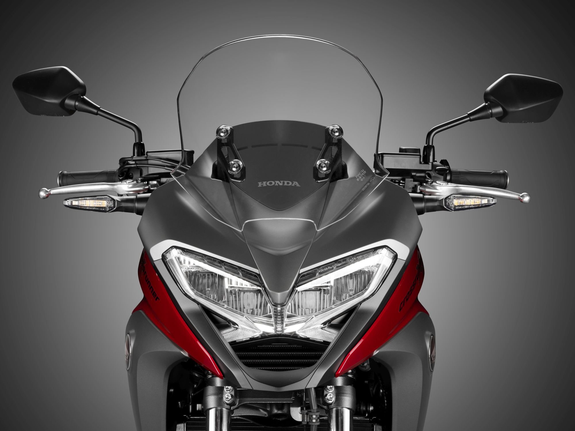 V-образная двойная фара спереди придает мотоциклу некой хищности в облике. От фар вверх поднимается прозрачный обтекатель, за которым разместилась цифровая приборная доска.