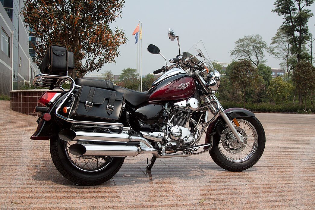 Уже на фото можно заметить, что это действительно настоящий дорожный байк для путешествий. Неопытный человек с трудностью отличит его от дорогих японских аналогов, что является большим плюсом. Спереди можно увидеть огромную фару и несколько маленьких рядом, а также ветровое стекло, которое защитит вас на большой скорости.