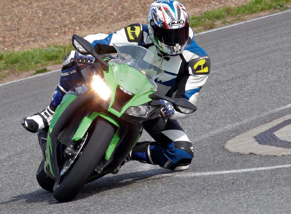 Эргономика «десятого» неплохо ориентирована на высокорослых пилотов (что, впрочем, не означает, что всякого рода карликам там будет неудобно). Общий стиль —«бескомпромиссный убийца», с тяжелой «челюстью» обтекателя, нависшего над передним колесом. Детали композиции — удары мечом и, как следствие, рубленые формы, прослеживающиеся даже в незначительных фрагментах модели. На фоне одинаковых, как парные носки, конкурентов, тяжелый скоростной поезд от Kawasaki с литерой ZX-10R мгновенно идентифицируется —редкий случай в современном мире однополых браков. Но на треке у нас случился языковой барьер! Где обещанные 200 л. с.?! До 10 000 об/мин, даже в самом «злом» режиме трехступенчатой системы контроля мощности, свирепая «десятка» едет на уровне Fireblade 2008 года!.. Да, после 10 000 об/мин специально обученный японский курьер «заносит» в парк недостающие 50 л. с., и в этот момент всё становится на свои места. Вернее, почти всё —стоковый рулевой демпфер Ohlins не в состоянии переварить столько мощности, «нос» мотоцикла беспомощно болтается даже на незначительных неровностях и почти на всех ускорениях… И это на фоне великолепно работающей подвески с нетронутыми заводскими регулировками. В 2013 году (у нас был мотоцикл 2012 года, без ABS) японцы де-факто признали за собой эту недоработку, оснастив мотоцикл совсем другим рулевым демпфером: тем же Ohlins, но уже электронно-регулируемым. В поворотах остро чувствовалось нежелание «вправляться», заходить в правильные траектории. Мотоцикл всё время пытался выплыть наружу, заметно «расширяя» предполагаемые выходы.