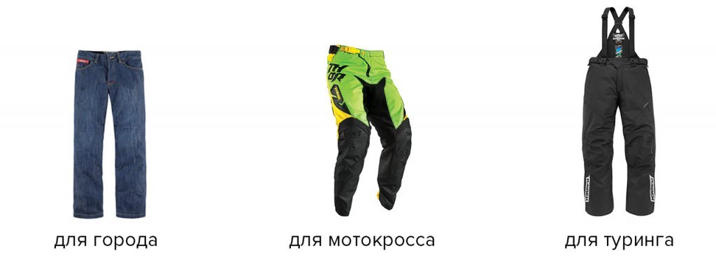 Под штаны должна влезать защита колен (если штаны не имеют встроенных наколенников). Выбирайте штаны с эластичными вставками, позволяющими свободно двигаться. Длина мотоджинсов должна быть такая, чтобы, когда вы садитесь на мотоцикл, ваши щиколотки были закрыты, а кроссовые штаны должны без проблем заправлялись в мотоботы.