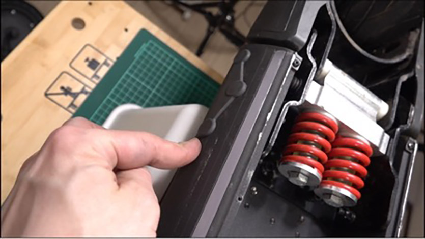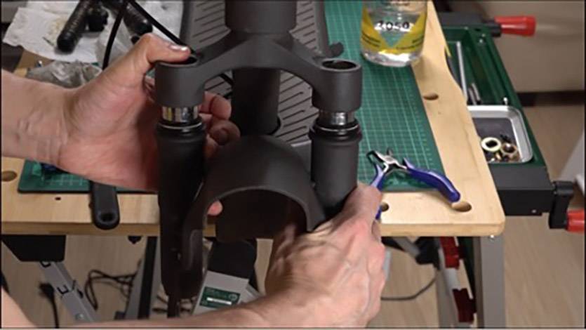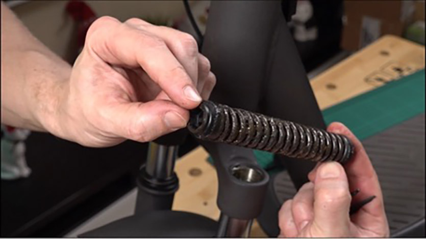 Если заглянуть глубже, то можно вытянуть пружину, на конце которой располагается пластиковый поршень. Внутри каждая нога вилки крепится болтом. При работе он опускается и поднимается.