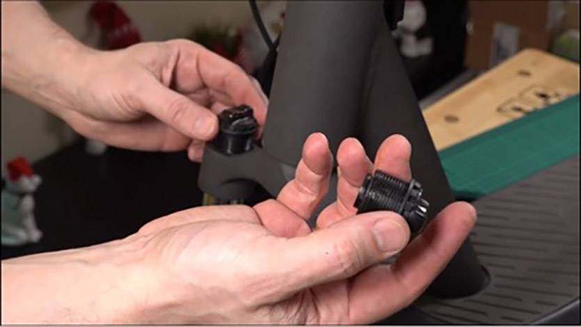 Основание рулевой колонки выполнено из алюминия, оголовье штока вилки – тоже, фиксирующий элемент выполнен из стали, ось механизма складывания – из алюминия.