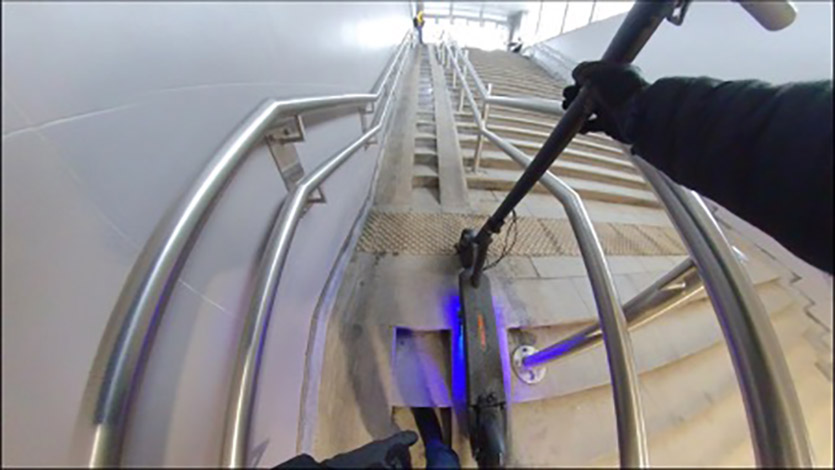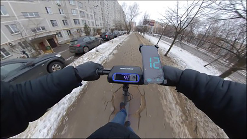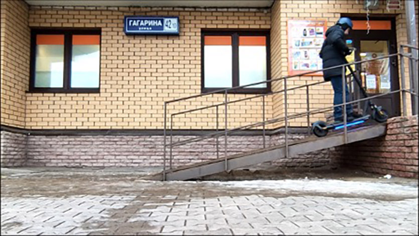Режим не нулевого старта при подъеме по пандусу дискомфорта не доставляет, мотор начинает работать при небыстрой ходьбе – тяги хватает на то, чтобы самокат по пандусу мог затянуть себя сам с небольшой пробуксовкой. Для пандусов дорожный просвет оказался маловат, и L9 цепляет днищем на углах пролетов.