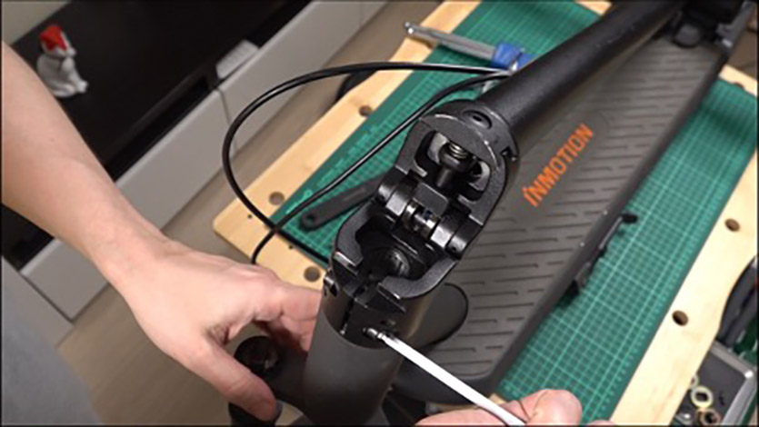 После распаковки, если вы еще ничего не знаете об этой модели, вам будет не так просто понять как его разложить и включить. Механизм складывания работает в несколько этапов и заставляет вас поработать руками (большой привет и респект проектировщикам E-TWOW, который складывается нажатием на педальку ногой). Чтобы разложить Inmotion L8, сначала необходимо отогнуть эксцентрик с правой стороны узла складывания, чтобы ослабить две половинки его корпуса, прикрученных к деке. Затем, по центру узла складывания, прижать к нему язычок, который его фиксирует и после этого можно поднимать рулевую в вертикальное положение до щелчка. И потом опять повернуть эксцентрик для надежной фиксации. Складывается все это в обратном порядке, но язычок не поддастся, пока вы не толкнете рулевую вперед.