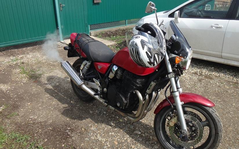 В динамике мот очень хороший, трогается плавно, козлить не пытается скорость набирает уверенно и бывает сам не замечаешь как уже притопил 110-120 км/ч (для кого как, а для ИЖа допустим это предел, и то если верить спидометру =)), собственно минус в том, что обтекателя здесь нет. А посадка прямая, поэтому пригибаться не очень удобно, а ветер бьет прямо в грудь. Очень классные тормоза уже в стоке идут брембо! Что касается подвески то она мягковата для наших не слишком ровных дорог и зачастую даже на трасе, если есть небольшие выбоины её пробивает, но насколько я понял это проблема всех японских четырехсоток…