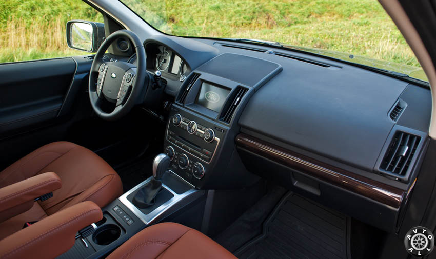 Салон Land Rover Freelander не отличается особой роскошью, как в Range Rover Evoque, но кожаные сиденья смотрятся достаточно роскошно, на дверях тоже кожа. Что еще хорошего – это высокая посадка, как на настоящих больших внедорожниках, таких как Range Rover Sport.