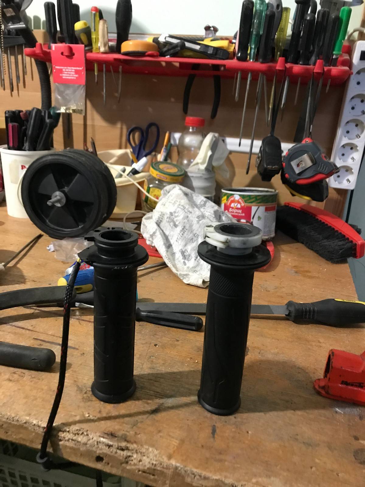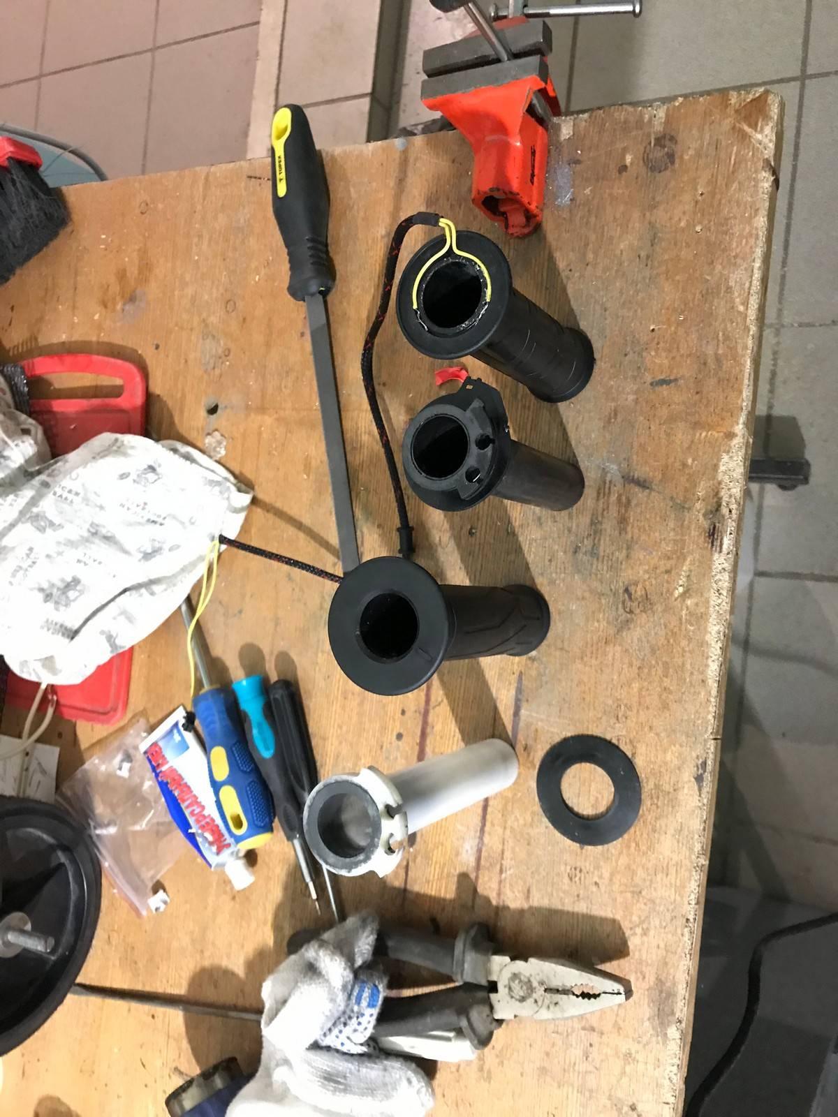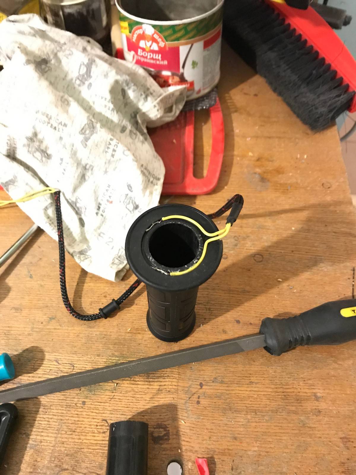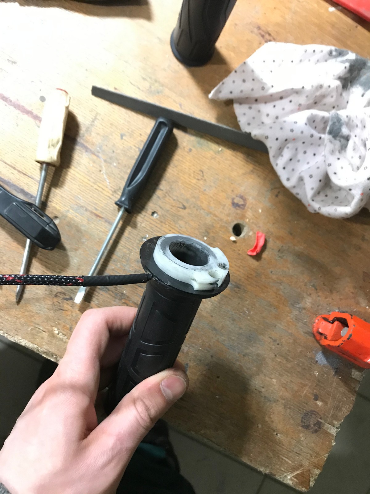 Рассмотрев и сравнив обе ручки, понял, что без доработки ставить их не стоит, так как диаметр окружности, на которую наматываются тросики, значительно меньше на китайской ручке. Это увеличивает угол, на который надо повернуть ручку, чтобы ускориться, и крайне неудобно в эксплуатации. Внимательно осмотрел китайскую ручку и принял решение ее разобрать, цена вопроса не так высока в случае поломки. Разобрал довольно легко, резиновая часть ручки надета на пластиковое основание с креплением тросиков. При разборке китайской ручки боялся повредить нити обогрева, но оказалось, что они находятся внутри резиновой части, и их не видно. С торца ручки входят нити и там же к ним припаяны провода для подключения