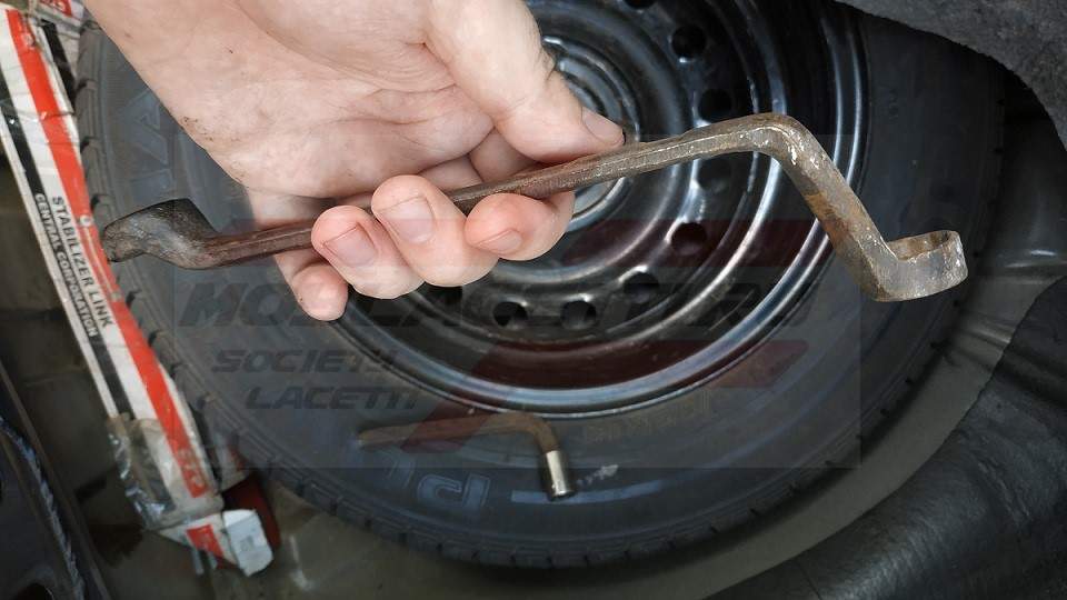 В багажнике работы окончены. Теперь вывешиваем колесо при помощи домкрата и снимаем его.