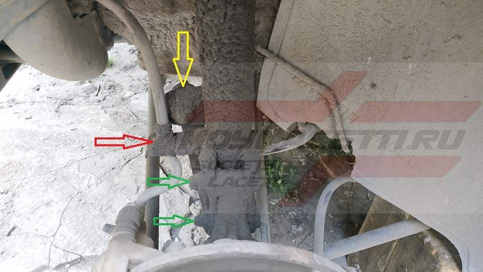 Открутить две гайки и извлечь болты крепления амортизационной стойки (зеленые стрелки)