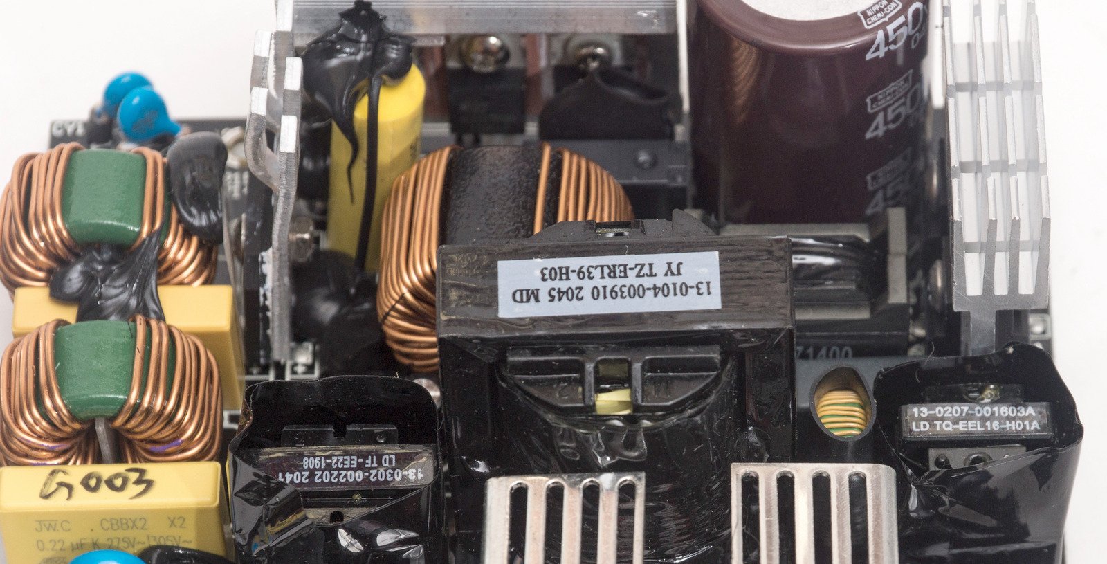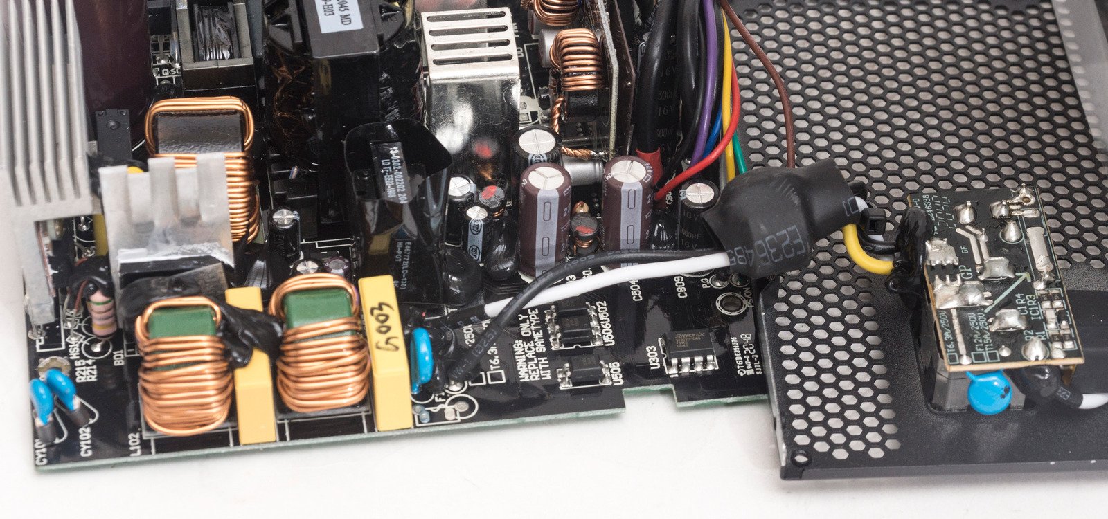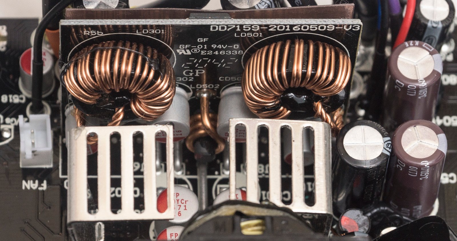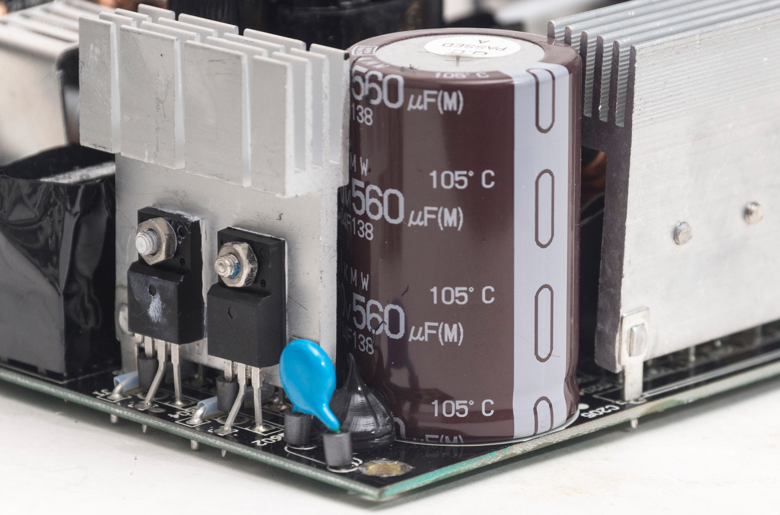 Фильтрация помех на выходах осуществляется за счет полимерных и электролитических конденсаторов японского производства Nippon Chemi-Con. В меньшем количестве присутствуют и китайские конденсаторы Elite.