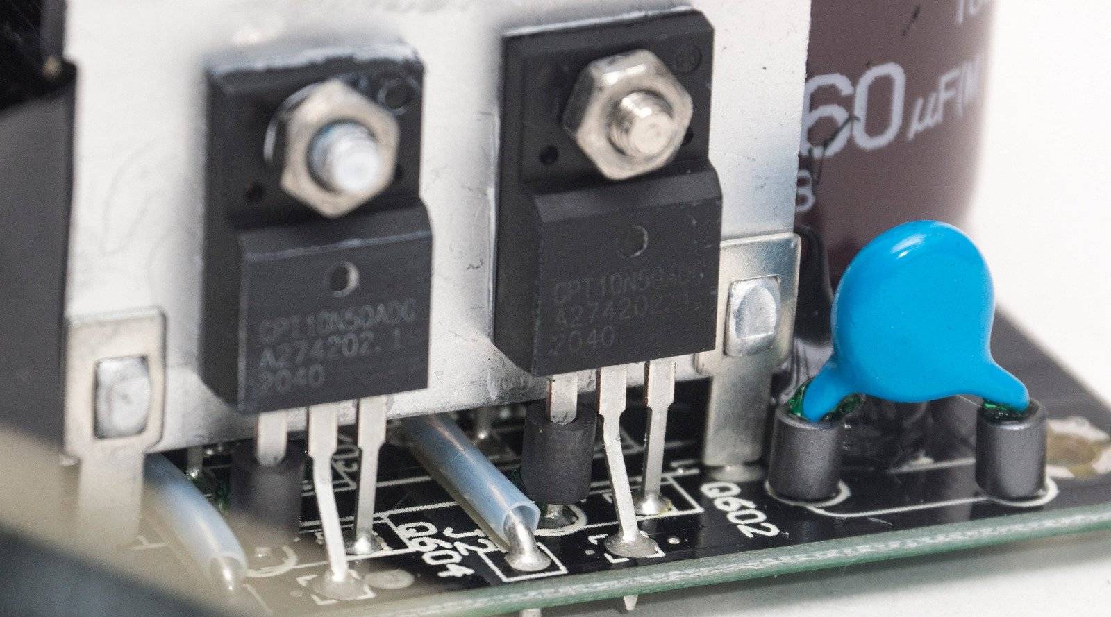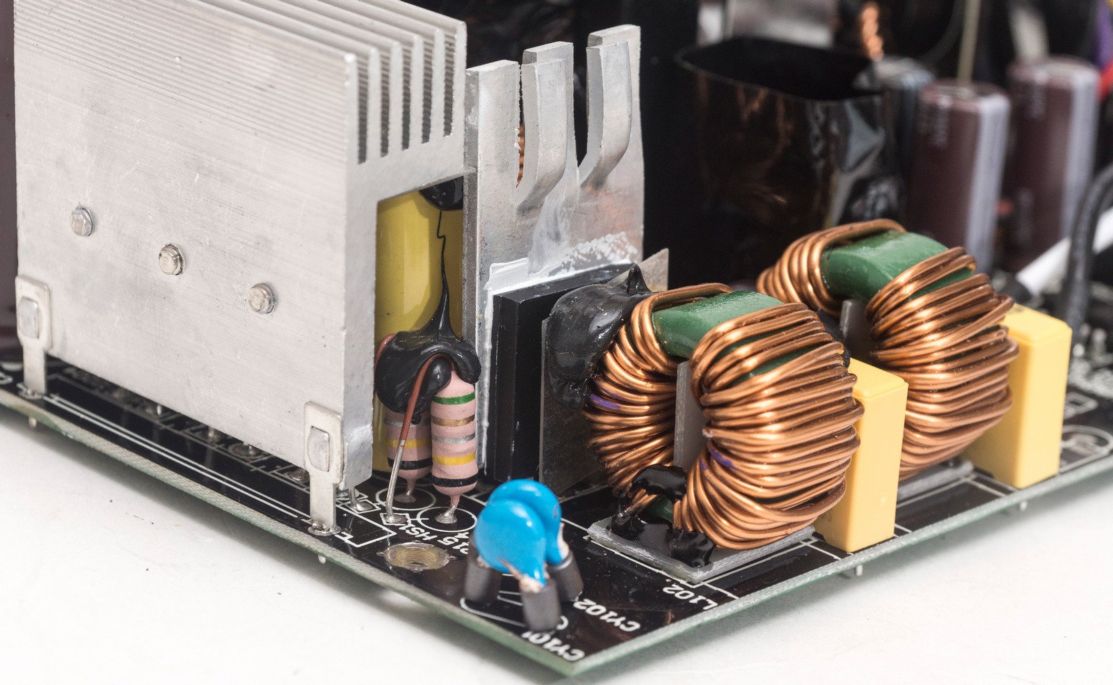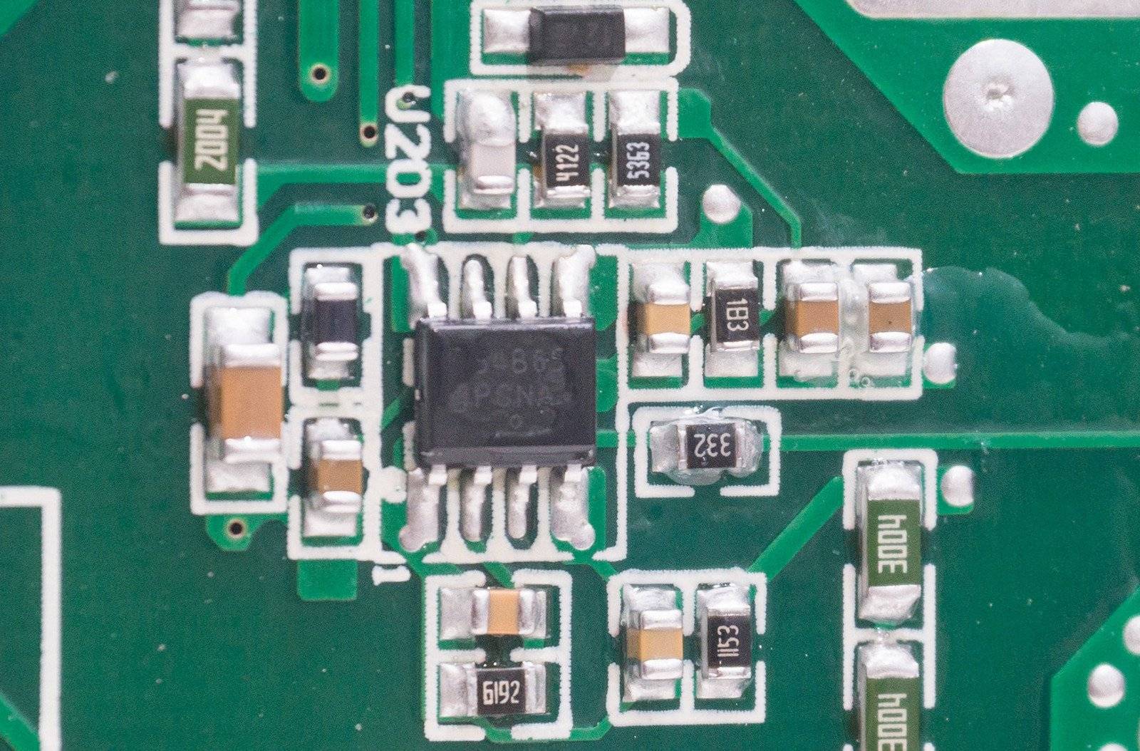 Фильтрация помех на выходах осуществляется за счет полимерных и электролитических конденсаторов японского производства Nippon Chemi-Con. В меньшем количестве присутствуют и китайские конденсаторы Elite.