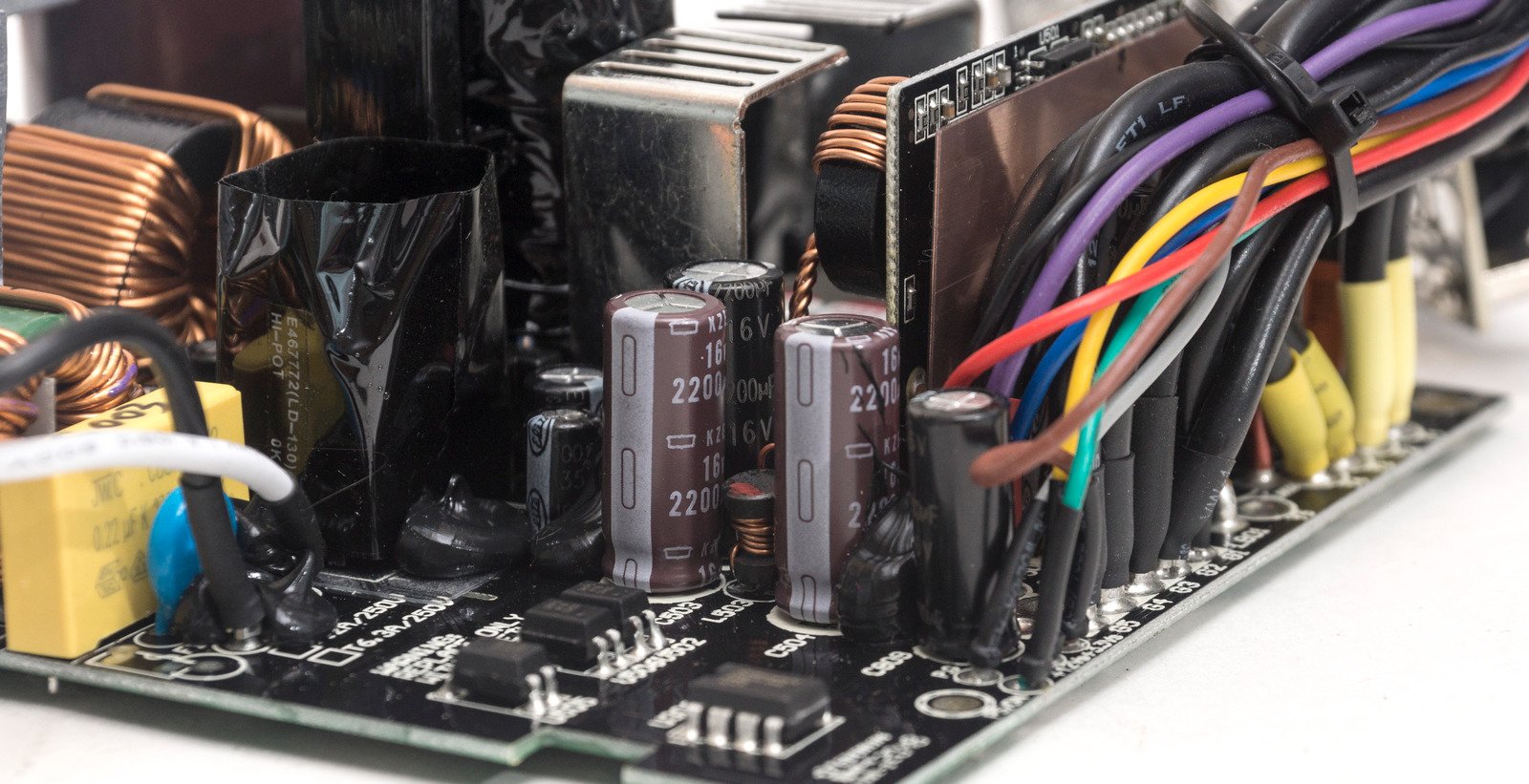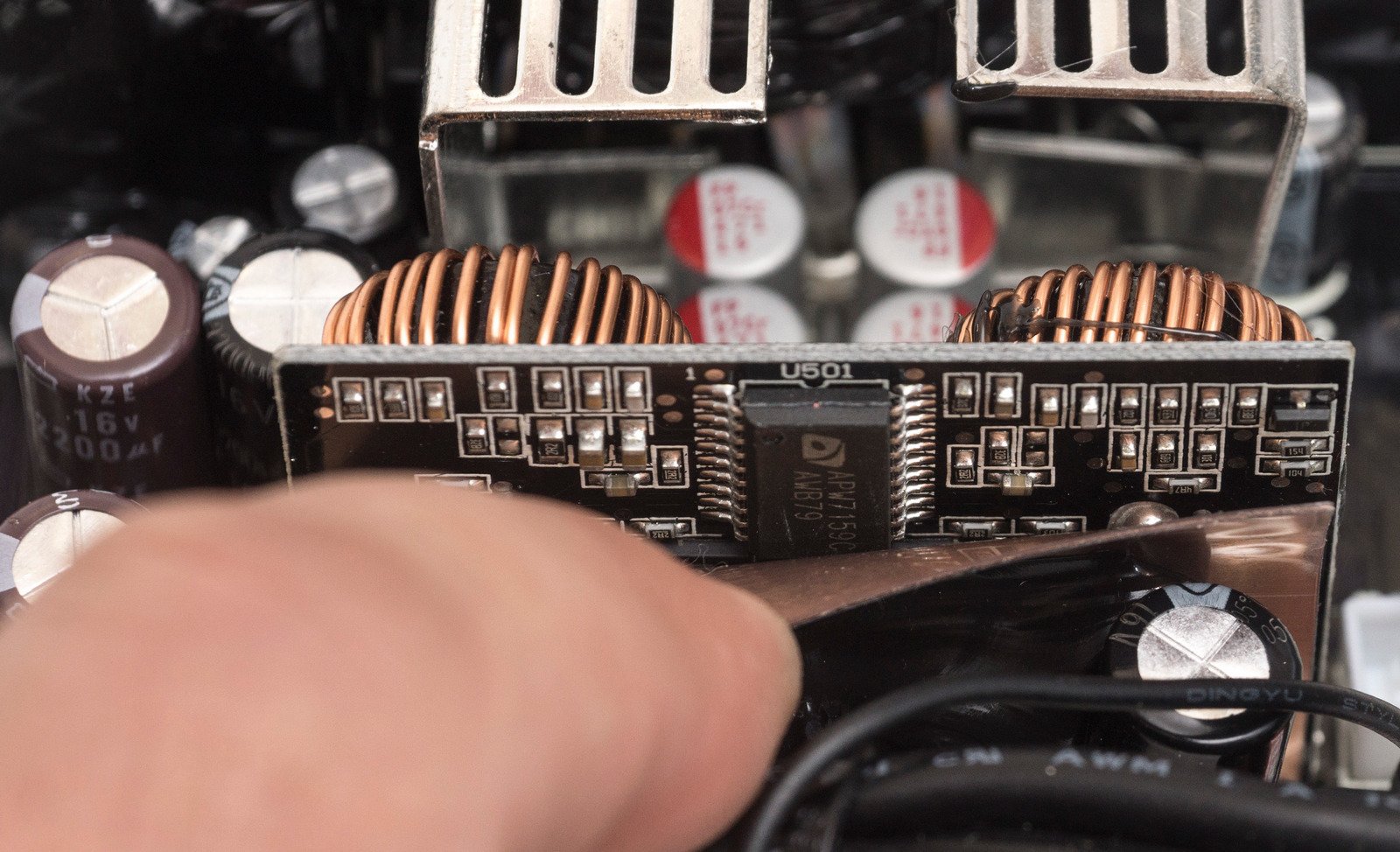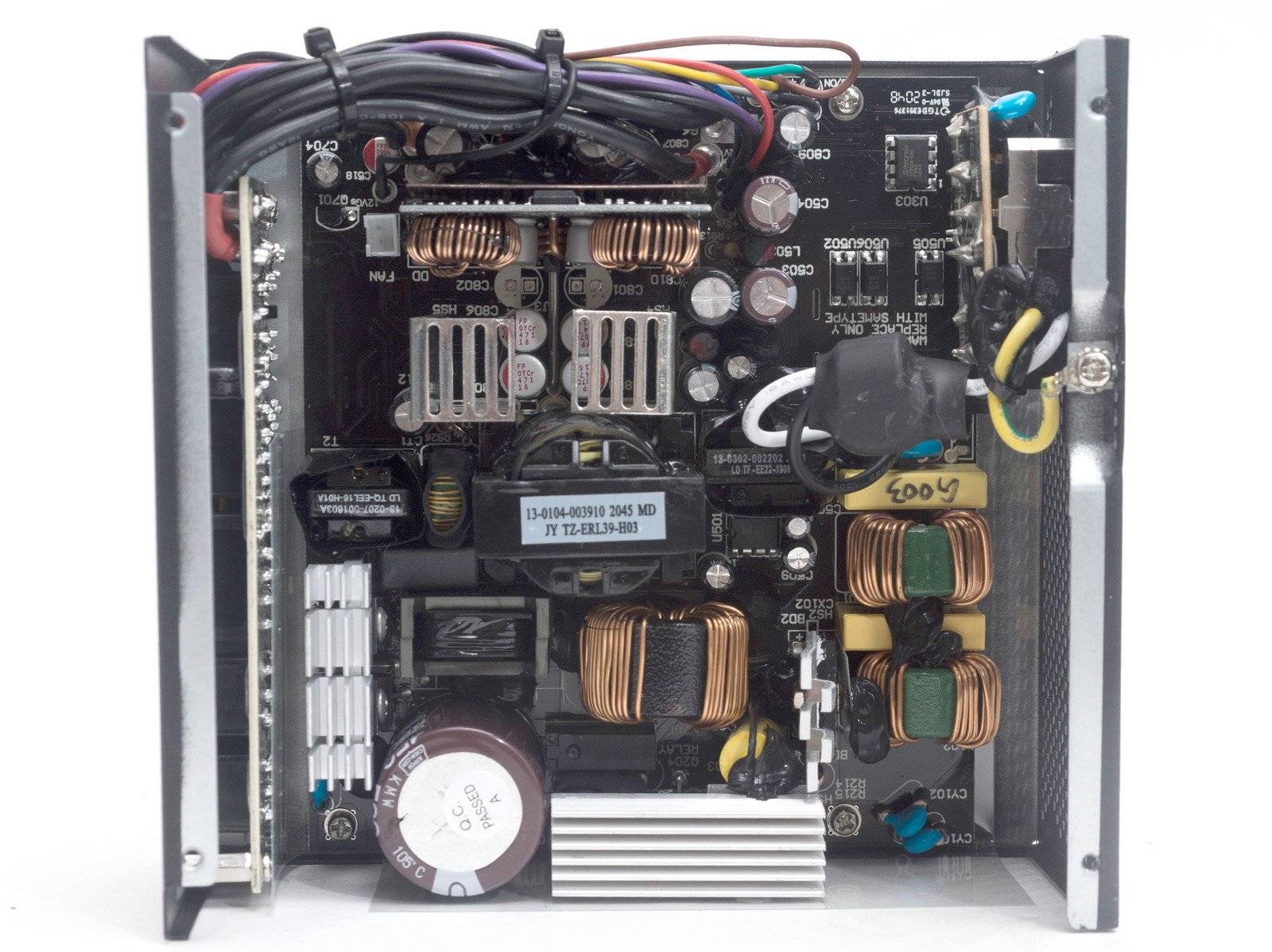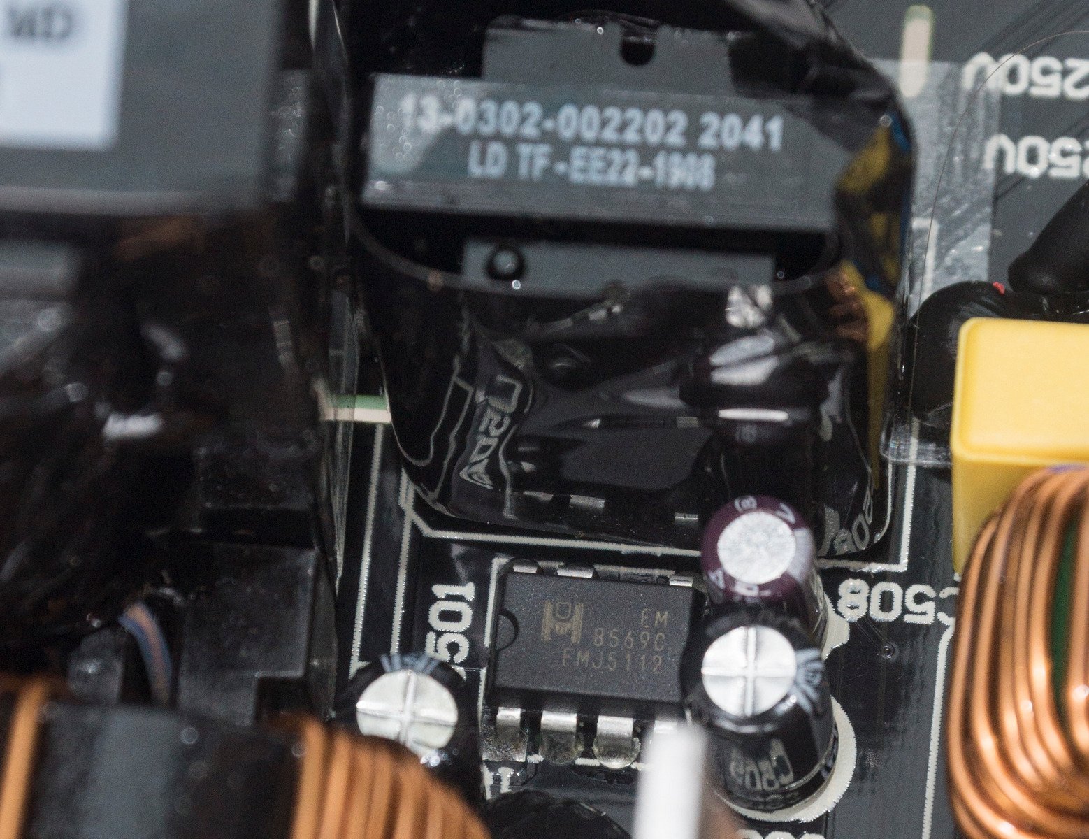 Фильтрация помех на выходах осуществляется за счет полимерных и электролитических конденсаторов японского производства Nippon Chemi-Con. В меньшем количестве присутствуют и китайские конденсаторы Elite.