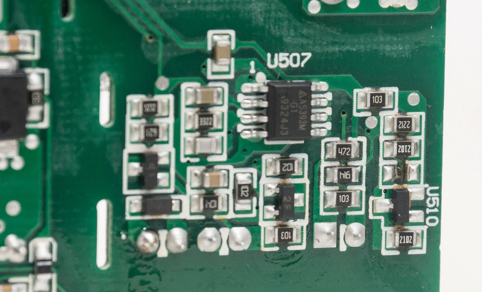С обратной стороны платы присутствует схема из компаратора напряжения AS393m и резисторов, также отвечающая за защиту дежурного напряжения.