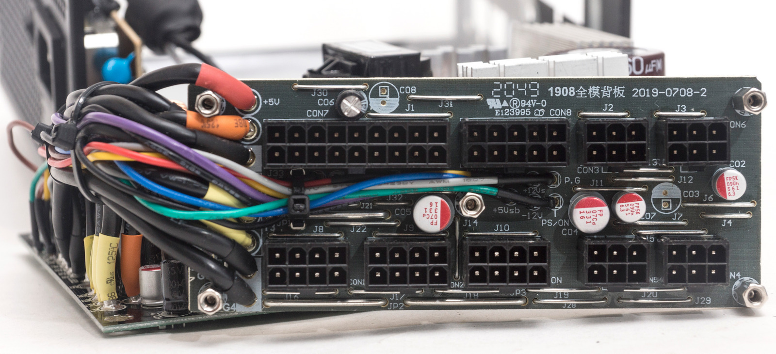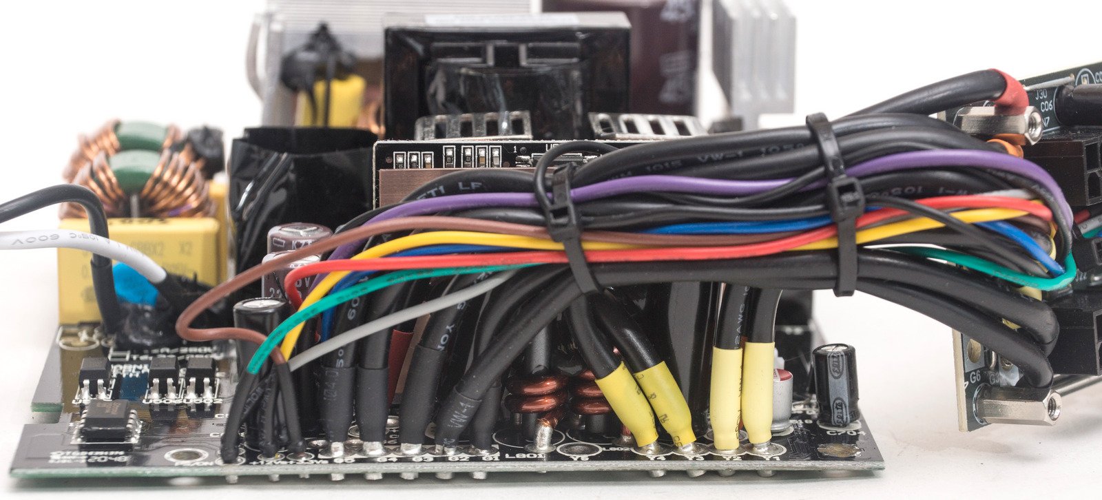Плата с разъемами для подключения модульных кабелей соединена с основной платой пучком проводов, что на сегодня выглядит как устаревший вариант, тем более для новой модели БП.