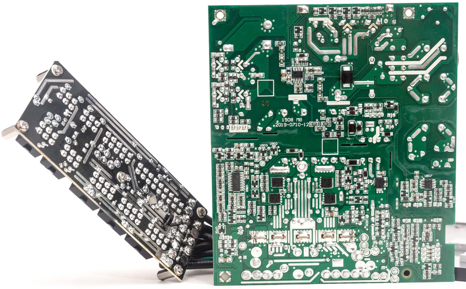 Низковольтные каналы +3.3 В и +5 В формируются DC-DC преобразователями. Находятся они на вертикальной плате, силовые элементы закрыты диэлектрической прокладкой, она же и отводит от них тепло.