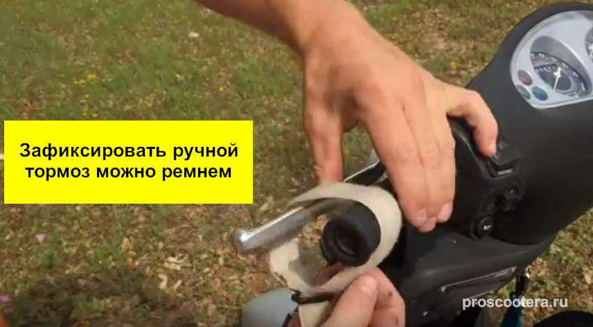 После этого ставим задний ручной тормоз на защелку, а если его нет, то завязываем зажатую ручку заднего тормоза тряпкой или веревкой, что есть под рукой.